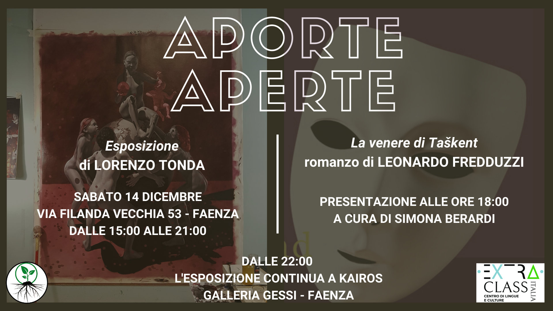 Sabato 14 dicembre, dalle 15:00 alle 21:00 Studio di Via Filanda Vecchia 53 a Faenza Esposizione di pittura e Presentazione de La venere di Taškent alle ore 18:00 Continua la rassegna A Porte Aperte, che vede lo studio di Via Filanda Vecchia 53 aperto al pubblico per presentare artisti locali e non. Dopo aver ospitato … Continua a leggere APORTE APERTE: l’arte di Lorenzo Tonda incontra la narrativa di Leonardo Fredduzzi
