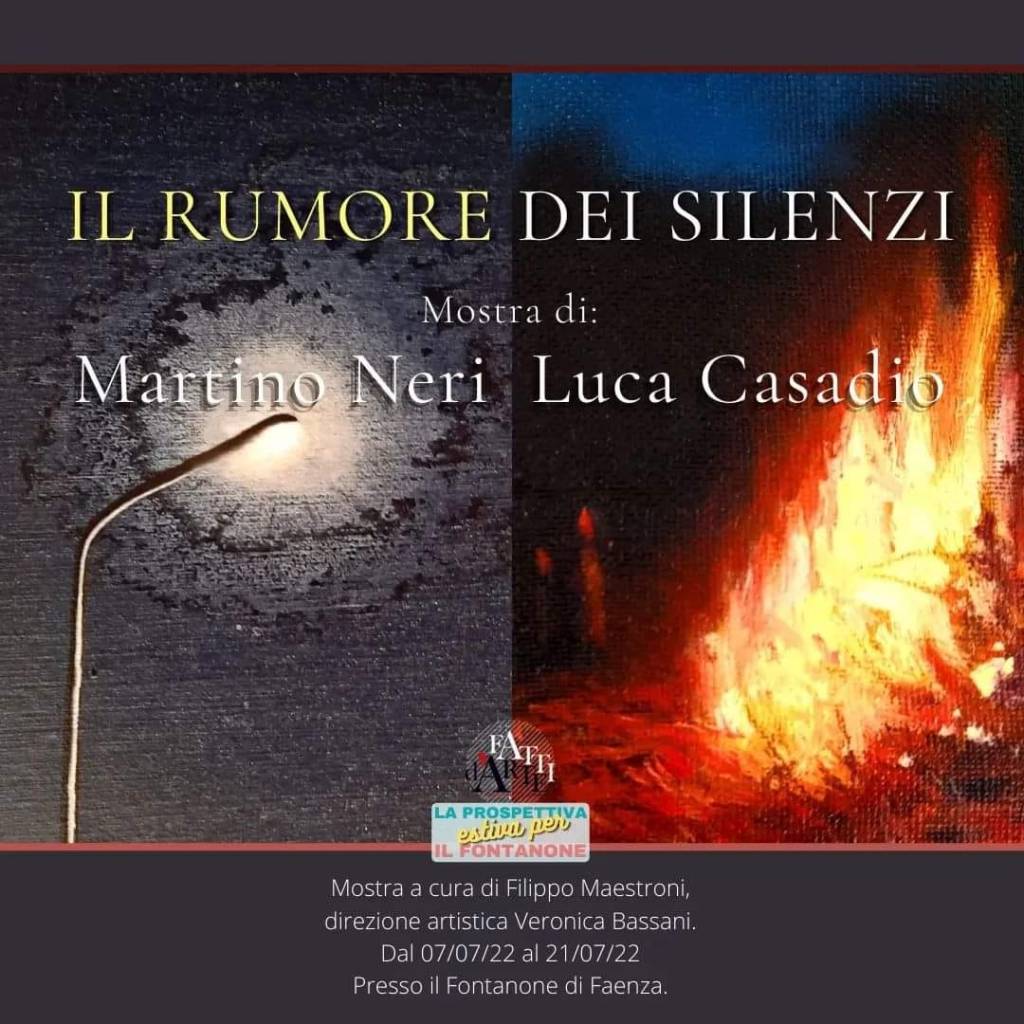 Una mostra di pittura pura, senza pretese, senza fronzoli, due artisti faentini, Luca Casadio e Martino Neri, la cui ricerca pittorica è legata al paesaggio, un paesaggio che per alcuni tratti, dettagli o ricordi, può ricondurci al nostro territorio, ai nostri parchi alle nostre campagne, ma privi di un vero contesto, sono luoghi pretesto, ambienti atti a cogliere suggestioni oniriche, scampoli di memorie invase dal silenzio della riflessione, ma in cui il colore ci rimanda ad una realtà sensoriale diversa è come se fossimo costretti ad ascoltarlo.