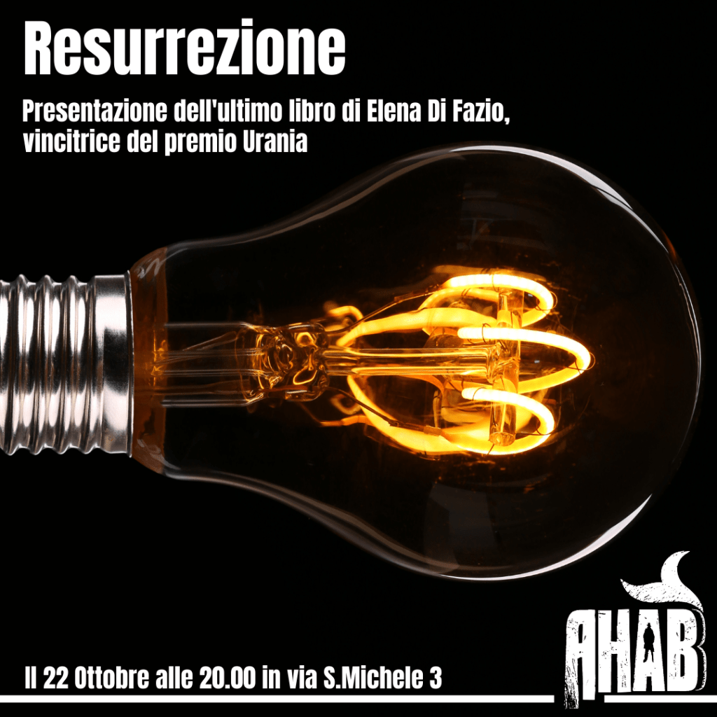 Venerdì 22 ottobre 2021, in Via San Michele n. 3, alle ore 20:00 viene presentato Resurrezione, edito da Mondadori in uscita a Novembre 2021 – romanzo con cui Elena Di Fazio ha vinto il Premio Urania 2020. Dialoga con l’autrice Rolando Leotta, coordinatore dello Studio Ahab – evento promosso dall’associazione PiGreco Apprendimento APS.