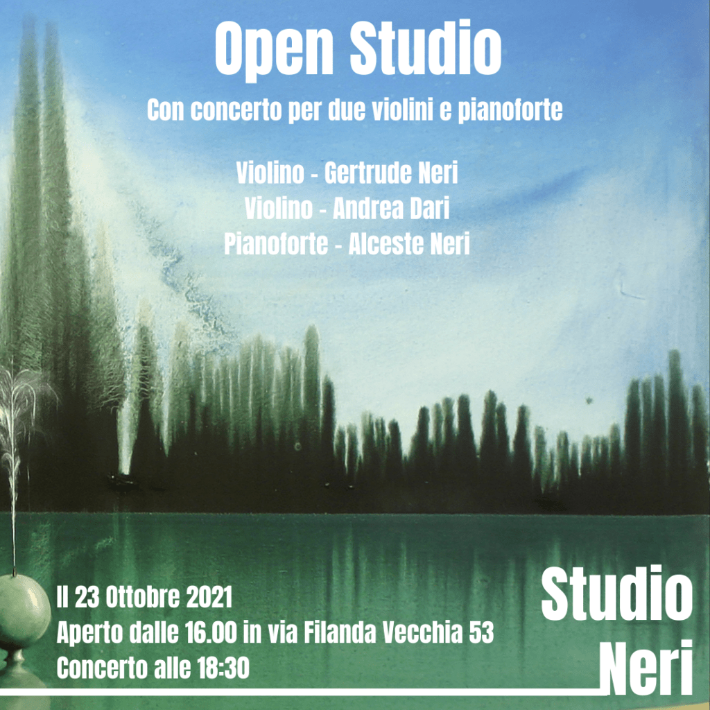 Sabato 23 ottobre 2021, in Via Filanda Vecchia n. 53, dalle ore 16:00 lo studio è aperto al pubblico, mentre alle 18:30 è previsto un concerto per due violini (Gertrude Neri e Andrea Dari) e pianoforte (Alceste Neri), sullo sfondo della pittura di Martino Neri -evento promosso dall’associazione SE.M.I. – Seeds for More Interculture APS.
